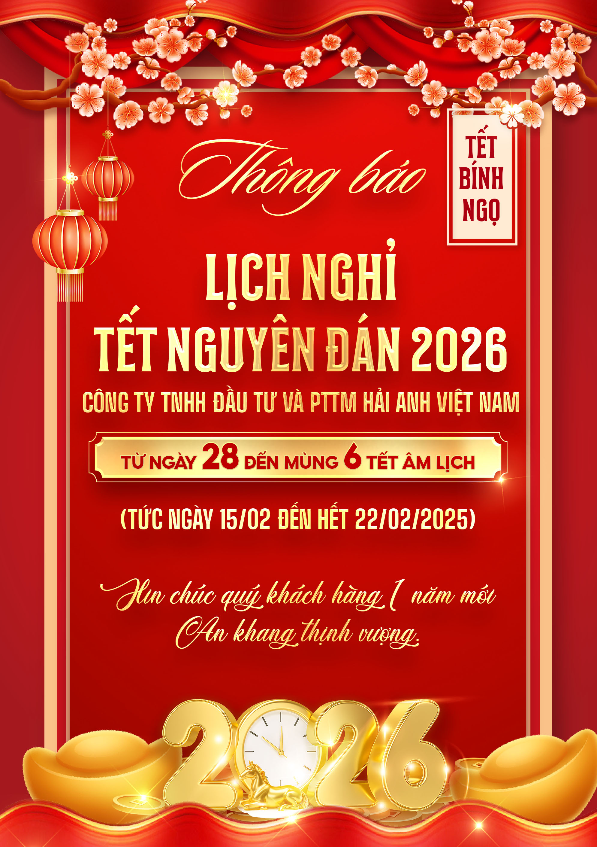 LỊCH NGHỈ TẾT NGUYÊN ĐÁN BÍNH NGỌ 2026